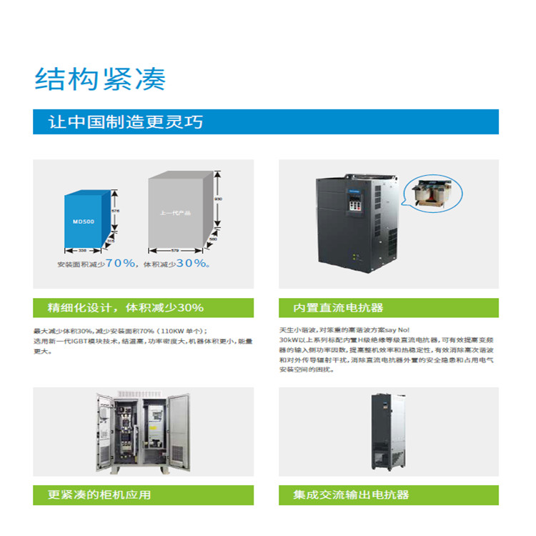 匯川變頻器MD500是匯川技術(shù)匯集了矢量變頻技術(shù)的高性能變頻器,憑借高性能的電流矢量技術(shù),可輕松驅(qū)動感應(yīng)電動機(jī)。MD500 采用高性能、高品質(zhì)、高功率密度設(shè)計,在易用性、可維護(hù)性、環(huán)保性、安裝空間和設(shè)計標(biāo)準(zhǔn)等方面有顯著提升,可進(jìn)一步優(yōu)化用戶的使用體驗。