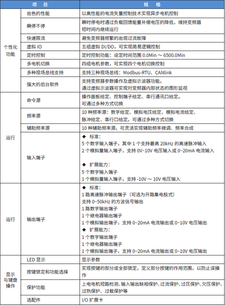 MD310 系列變頻器是一款通用緊縮型多功能變頻器,采用開環(huán)矢量和V/F 控制方式,以高性能的電流矢量控制技術(shù)可實(shí)現(xiàn)異步電機(jī)控制。MD310 標(biāo)配RS485 通訊接口,支持Modbus RTU 通訊,可擴(kuò)展I/O 擴(kuò)展卡、CAN 通信擴(kuò)展卡。內(nèi)置PID 可方便實(shí)現(xiàn)閉環(huán)過程控制系統(tǒng),最多可實(shí)現(xiàn)16 段速運(yùn)行。